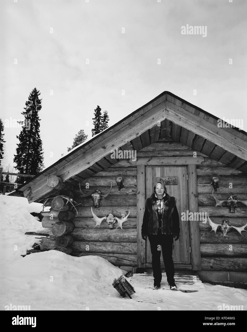 Finlandia, Artic, Nunnanen, mujer madura de pie delante de la granja de