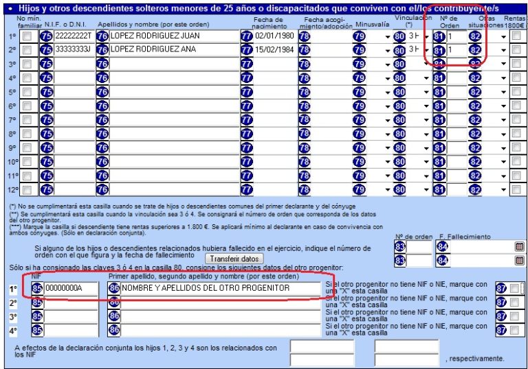 Información adicional Anexo D. 5.2. Hijos y otros descendientes. 5.2.1. Hijos menores de 18 años y mayores sujetos a patria potestad prorrogada o rehabilitada. 5.2.2. Hijos mayores de 18 años y otros descendientes. 5.2.3 Hijos integrantes de la unidad familiar que no hayan percibido rentas y otros descendientes con derecho al mínimo.