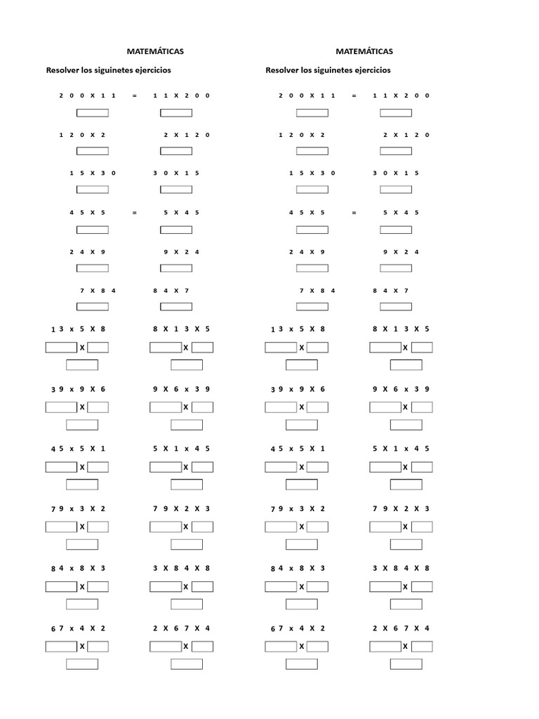 Ejercicios de Multiplicación Propiedad Asociativa y Conmutativa