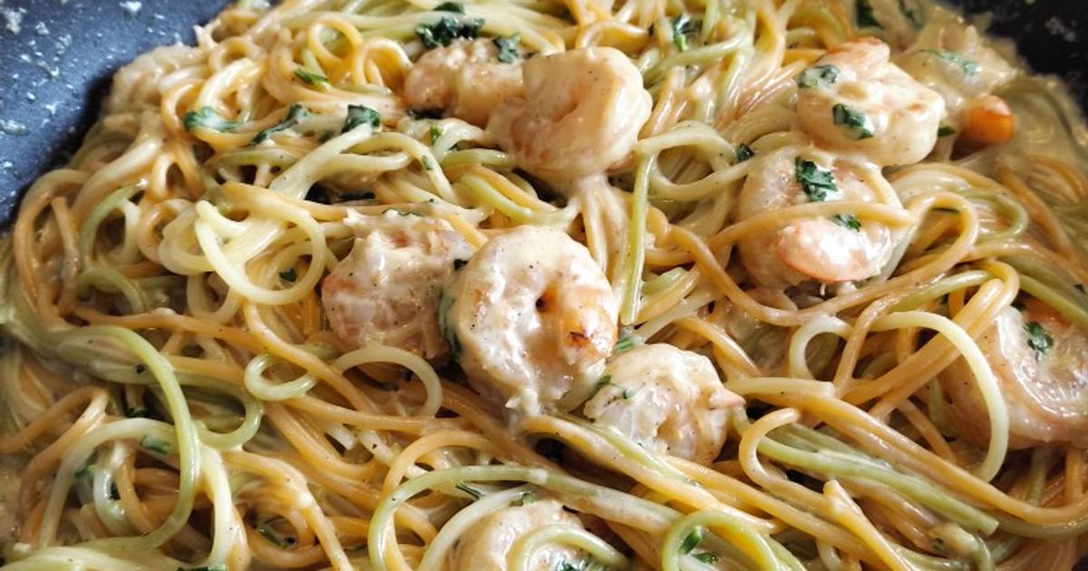 Preparación. Cocinar la pasta: En una olla grande con abundante agua hirviendo y sal, cocina la pasta según las instrucciones del paquete hasta que esté al dente. Reserva 1 taza del agua de cocción antes de colarla. Saltear los camarones: Mientras se cocina la pasta, calienta el aceite de oliva en una sartén a fuego medio.
