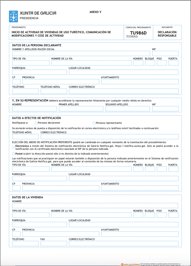 Antes de comezar a alugar como vivenda de uso turístico debes rexistrar a propiedade, e para iso tes que comunicar a alta a Turismo de Galicia. Podes facelo nos rexistros públicos ou por internet na sede electrónica da Xunta de Galicia, aportando: Pago Taxa Turismo de Galicia; Anexo V: Declaración responsable
